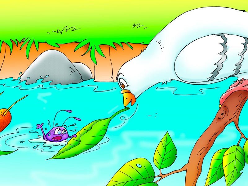 Una paloma vio cómo una hormiga caía en un arroyo y trataba en vano de llegar a la orilla. La paloma sintió pena y decidió ayudarla. Entonces dejó caer la hoja de un árbol junto a la hormiga y esta se aferró a ella y flotó hasta llegar a salvo a la orilla.