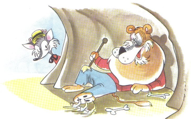 Un león tenía las garras y los dientes tan gastados que ya le costaba conseguir alimentos. Entonces se le ocurrió hacerse el enfermo y avisó a todos los animales y se acostó a esperar su visita. Cuando estos llegaban, el león los devoraba de golpe.