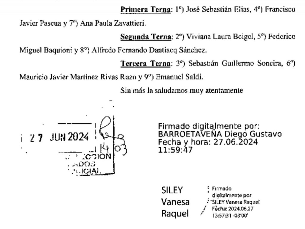 Esta es la terna radical, con algunas cuestiones graves, el Dr. Sebastián Soneira, maestre menor de Alfredo Cornejo en la Logia Judicial, que lo impulsa a todo aquello posible, el gobernador para pagar todo el trabajo sucio realizado ,con mucha astucia del candidato, desde colegios de abogados y consejo de la magistratura y con algo muy grave, está muy por detrás en el orden de méritos, de los correligionarios de terna, pero no ha asistido a esa variable de colocación y fortalecimiento de candidatos inventada para premiar cuando los exámenes que componen la nota final del orden de mérito, no le ha sido favorable. El Dr. Soneira es el único integrante de ternas que no realizó, “la entrevista” que nos deja dos puntos a tratar, si la hacen aparecer, para quitar argumentos de corrupción a esta nota, es irregular, ya que no asistió, como los demás, a la mencionada entrevista, no pudiendo los evaluadores cuantificar un resultado, pero si no asistió y mágicamente apareció la entrevista que nunca hizo, es escandalosamente irregular.