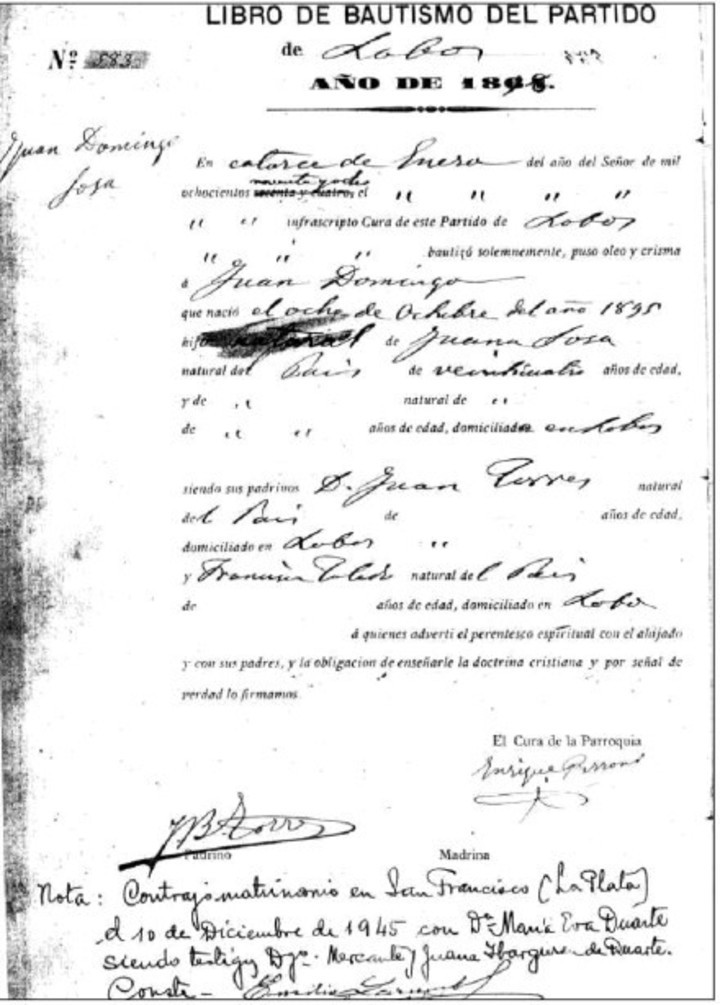 El tres veces presidente argentino, Juan Domingo Perón fue, según su acta original de nacimiento, Juan Domingo Sosa.