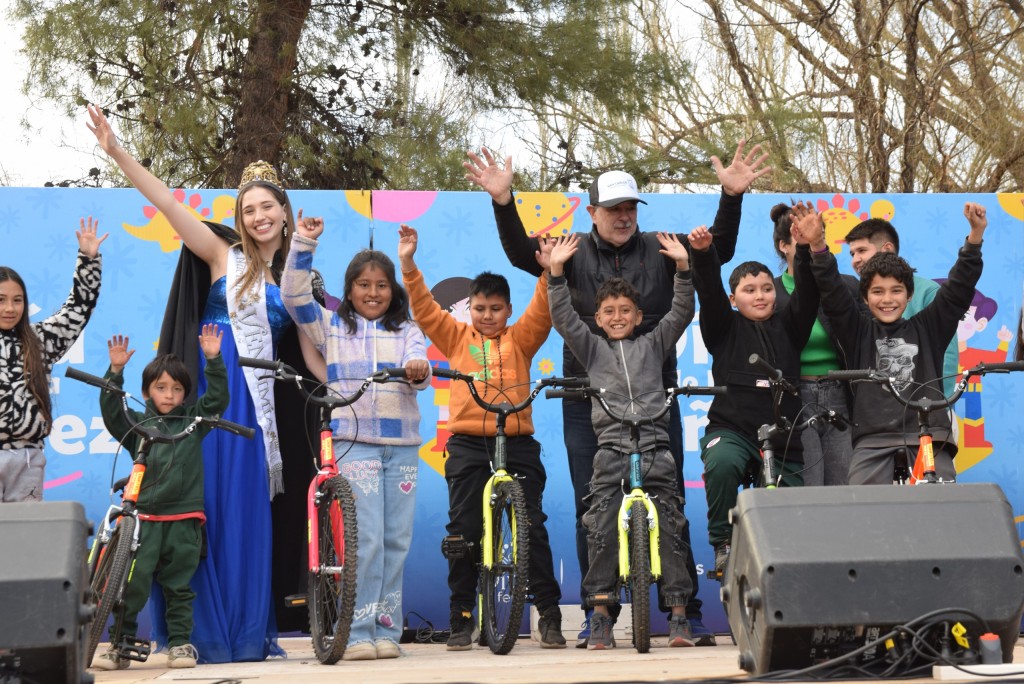 El Paseo de Artesanos y los Food Trucks también formaron parte del festejo, ofreciendo a las familias una amplia variedad de productos artesanales y opciones gastronómicas, que complementaron este día tan hermoso lleno de diversión. El escenario del teatro Neyú Mapú estuvo activo durante toda la tarde, brindando un espacio para el disfrute de cientos de familias, en esta oportunidad estuvimos acompañados por El Payaso Chapote que llenó de alegría todo el día. Además de las presentaciones de Las Galácticas, los Zanquistas, el grupo de Los Backyardigans y sus amigos que recorrieron todo el predio llevando diversión para todos los niños, de la misma forma Tito el Titiretero continuo con la animación. Durante estos espectáculos, se entregaron cientos de regalos, haciendo de la jornada una experiencia memorable para los más pequeños, donde agradecemos a cada uno de los proveedores y prestadores de servicios que anteriormente habían brindado diferentes regalos para este día tan especial. El cierre del evento estuvo marcado por el sorteo de 13 bicicletas, uno de los momentos más esperados de la jornada. El Intendente Municipal Dr. Alejandro Morillas hizo entrega de las mismas a los ganadores, cerrando así un día de celebración que unió a la comunidad en un ambiente de alegría y participación.