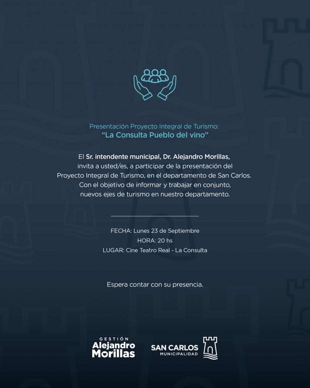 La Consulta, Pueblo del Vino, es un proyecto a cargo de un comprometido equipo municipal que abarca todas sus áreas y que trabaja junto a un grupo de profesionales dedicados al asesoramiento en desarrollo de innovadoras experiencias y planes turísticos de la consultora Tornare Place Branding. Además, suma el apoyo del Ente Mendoza Turismo a través de su presidenta Gabriela Testa junto con el Director de Desarrollo Turístico Marcelo Reynoso, precisamente oriundo del pueblo, quienes apuntan en forma articulada a involucrar al sector privado con el objetivo de materializar este desarrollo turístico que traerá beneficios económicos, sociales y culturales a los residentes locales, para que cada visitante se lleve una experiencia única.