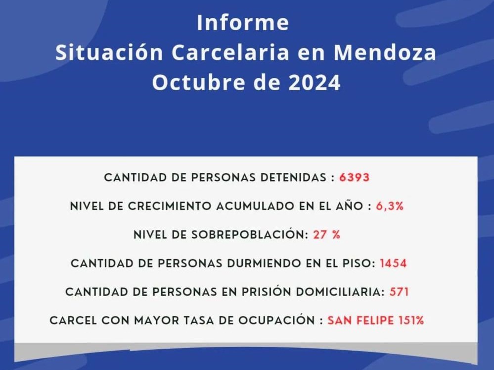 En Mendoza al día de la fecha hay 6393 personas detenidas, un 6,3% en nivel de crecimiento acumulado, el nivel de sobrepoblación es del 27%, la cárcel de San Felipe tiene una tasa de ocupación del 151%, 1454 detenidos duermen en el piso y 571 personas están detenidos con prisión domiciliaria.