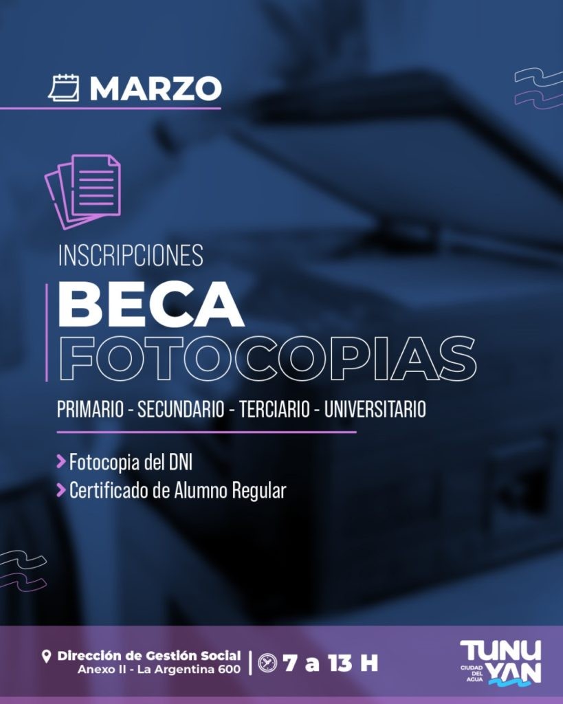 Con el objetivo de apoyar a estudiantes de distintos niveles educativos, la Dirección de Gestión Social de Tunuyán ha abierto las inscripciones para acceder a la Beca de Fotocopias. Esta iniciativa busca facilitar el acceso al material de estudio a alumnos de nivel primario, secundario, terciario y universitario.