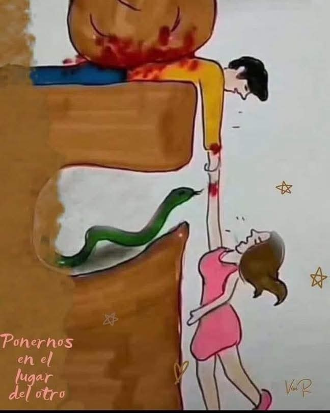 El hombre no sabe que hay una serpiente debajo. La mujer no sabe que hay una piedra aplastando al hombre.