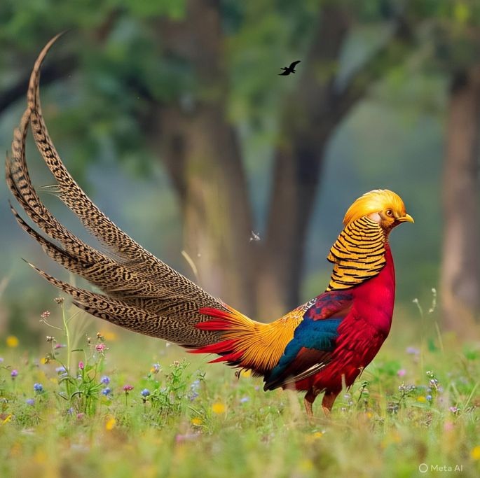 El Faisán Dorado (Chrysolophus pictus) es una especie de ave galliforme originaria de las montañas de China y el Tíbet. Es conocido por su plumaje vibrante y colorido, que incluye tonos dorados, rojos, verdes y azules.