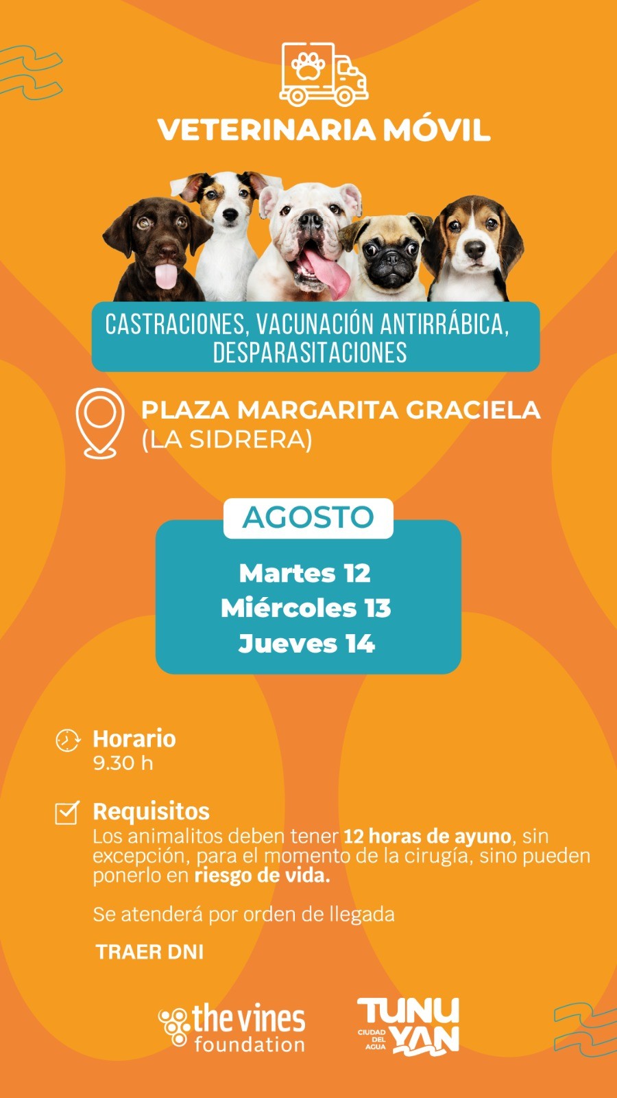Se realizar castraciones, vacunación antirrábica y desparasitaciones, los dias 12, 13 y 14 de agosto en la Plaza Margarita Graciela (La Sidrera). Desde las 09:30 hs.
