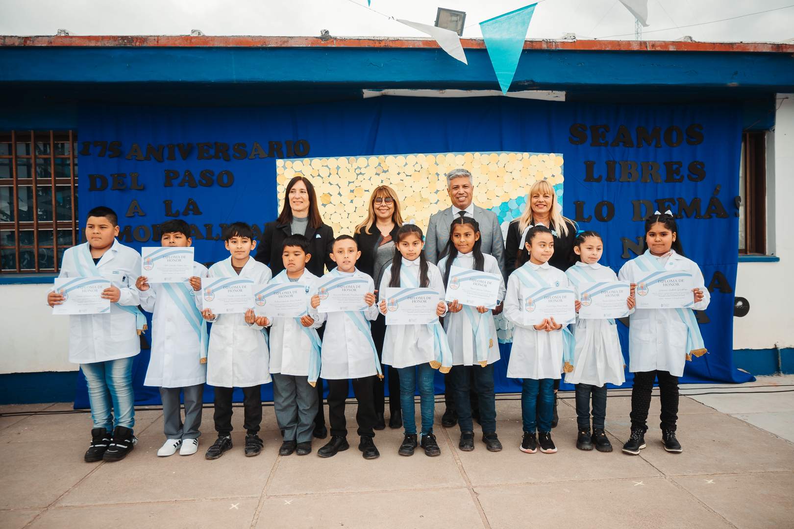 Bajo la premisa de federalizar los actos patrios oficiales la Municipalidad de Tupungato llevó adelante, el jueves 14 de agosto, la ceremonia conmemorativa del 175° Aniversario del Paso a la Inmortalidad del General José de San Martín, en la Escuela Dr. Antonio Scaravelli, ubicada en el distrito Zapata, y contó con la destacada participación de la Banda Militar Talcahuano y de las banderas de ceremonias de las instituciones escolares de la zona.El evento inició con la entonación del Himno Nacional Argentino y del Himno a San Martín. Posteriormente se realizó un minuto de silencio y se colocó una ofrenda floral en memoria del Libertador. A continuación, alumnos y alumnas de 4° y 5° grado realizaron la Promesa de Lealtad a la Bandera Provincial, cuya resolución fue leída por la Inspectora Técnica de la Dirección General de Escuelas. Los estudiantes recibieron luego certificados de honor por su compromiso y participación.Durante el acto se dirigieron a los presentes el Intendente de Tupungato, Gustavo Aguilera y la Directora de la institución anfitrión, Roxana Molero, quienes resaltaron la figura de San Martín y el valor de mantener viva su memoria a través de las nuevas generaciones.En su mensaje, el Intendente Gustavo destacó también los hitos sanmartinianos que guardan relación directa con Tupungato, como la presencia histórica de la Banda Talcahuano, el Regimiento de Infanteria de Montaña 11 "Grl. Las Heras" y la Posta "La Estacada", recordando que nuestro departamento no solo honra a San Martín con palabras, sino con huellas vivas de su paso y de su gesta libertadora.Antes de la despedida, la Banda Militar Talcahuano ofreció un despliegue musical de canciones populares acompañadas por parejas de bailarines.El cierre artístico estuvo a cargo de los propios alumnos de la escuela: los más pequeños, caracterizados como "pequeños soldados” y el propio San Martín, marcharon al ritmo de una canción infantil dedicada al prócer; estudiantes de 5° y 6° grado presentaron una danza con lazos celestes, blancos y amarillos; y finalmente, todos juntos interpretaron la cueca Contame José, acompañados por el teclado de su profesora de música y la guitarra de un talentoso alumno de 5° grado.Además en el evento se expuso la Muestra Fotográfica del certamen "Bicentenario de las Máximas para Merceditas", un concurso organizado por el Honorable Concejo Deliberante de Tupungato y la Asociación Cultural Sanmartiniana Valle de Uco; la premiación de las capturas ganadoras será el próximo domingo 24 de agosto.De este modo, Tupungato rindió homenaje al Padre de la Patria con un acto cargado de tradición, historia y emoción, donde la comunidad reafirmó el legado sanmartiniano como ejemplo de unidad y compromiso con la Nación.Asimismo, el domingo 17 de agosto, fecha del aniversario del fallecimiento del General San Martín, se realizó el izamiento de banderas, el canto de la Aurora y el Himno Nacional Argentino y el Himno a San Martín; y a la hora decretada se procedió a arriar la Bandera a media asta en señal de respeto y memoria al Libertador.