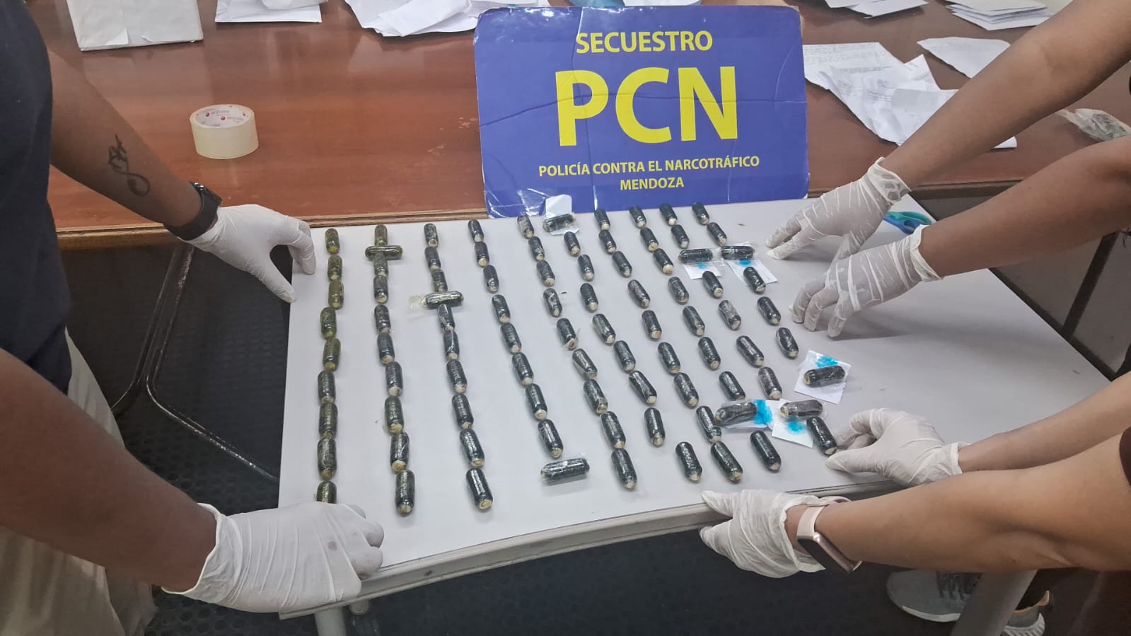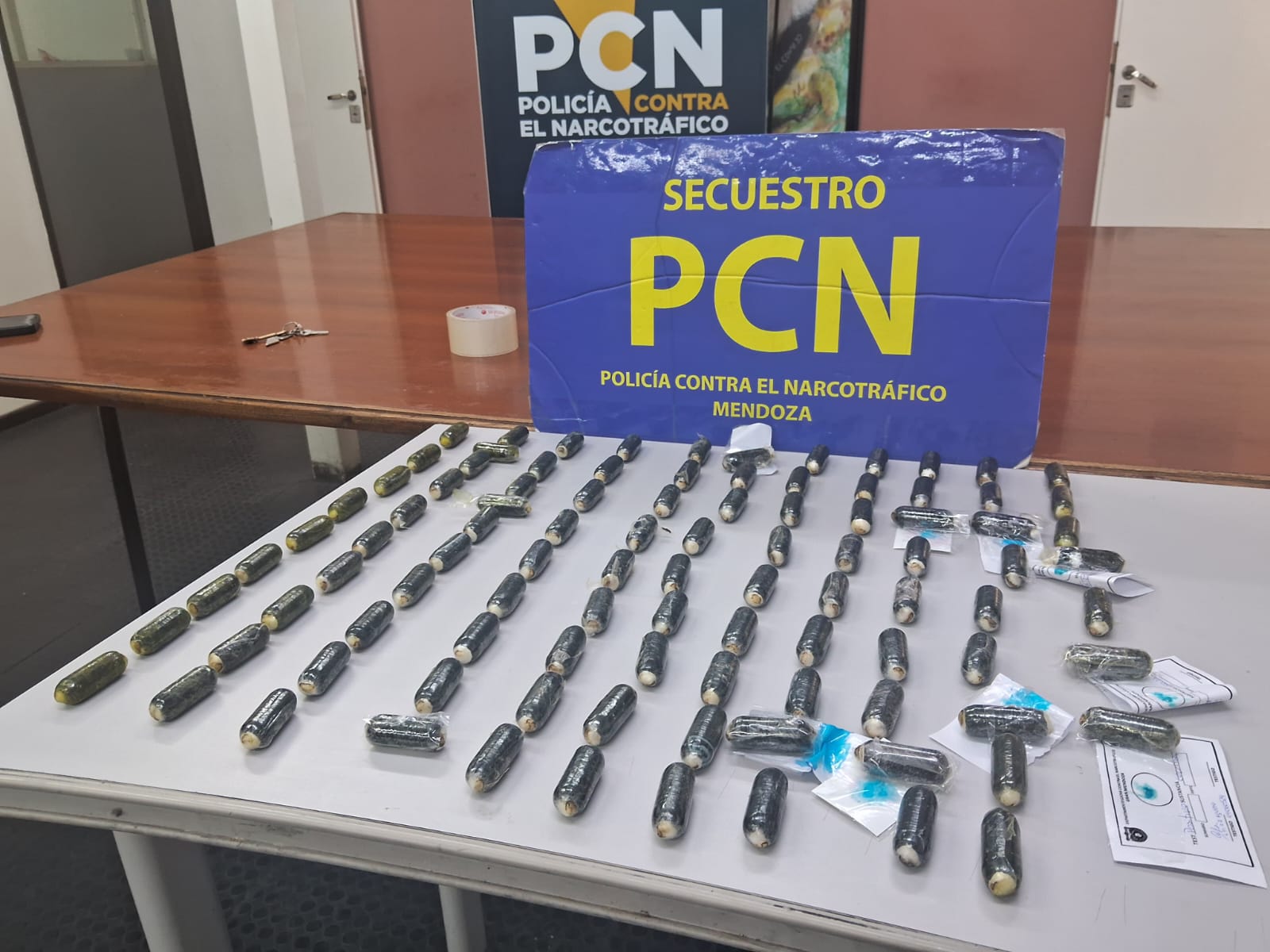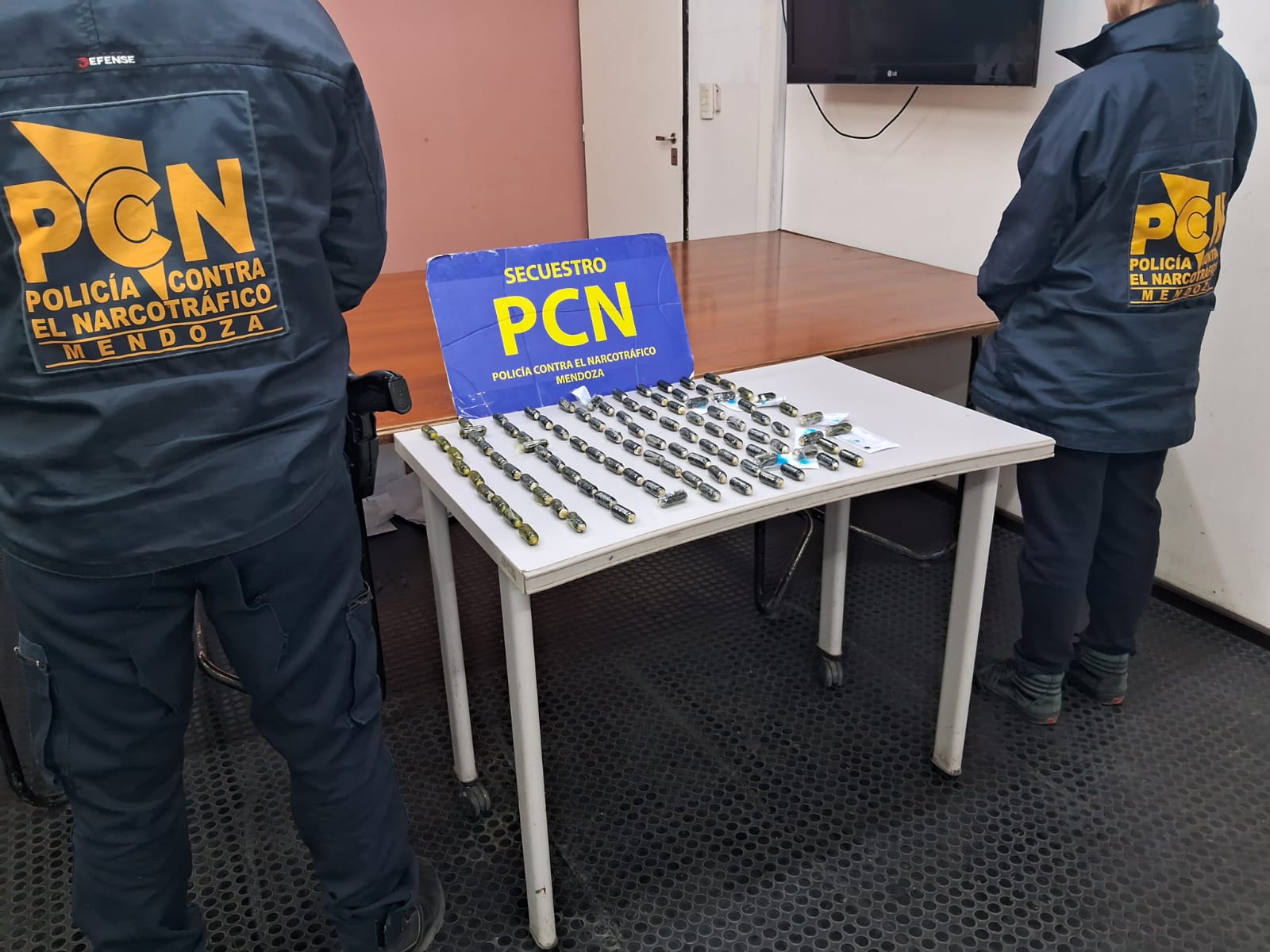 De tareas realizadas por los investigadores se determinó que MAMANÍ, se encontraba en la República de Bolivia y que arribaría a la Provincia de San Juan el día 8 de octubre, ante ello y por disposición del Dr. RODRIGUEZ IFANTE, una comitiva del personal de la Jefatura de Lucha contra el Narcotráfico (PCN) se trasladó hasta San Juan, logrando en Ruta 141 e intersección con Ruta 20 de Caucete, dar con el TOUR DE COMPRAS donde viajaba la mujer investigada y advirtieron que estaba en compañía de otra femenino de nacionalidad boliviana de apellido SOTO. En un primer control no lograron el hallazgo de sustancia alguna, pero con el correr de los minutos manejaron la hipótesis que alguna de las dos o las dos habrían ingerido cápsulas de cocaína (en la jerga se les denomina capsulero/a, a una persona que ha deglutido clorhidrato de cocaína, en envoltorios o paquetes con la forma de una zanahoria pequeña, recubierta de látex, esto último para evitar que los jugos gástricos rompan el envoltorio mientras esos cuerpos extraños se encuentren en el interior del sistema digestivo, situación que es letal para la persona portante). Por ello y por orden de la autoridad judicial competente, se derivó a ambas mujeres hasta un Centro Médico Asistencial de la Provincia de San Juan, en donde de un examen clínico los profesionales determinaron que SOTO, presentaba cuerpos extraños en su sistema digestivo, por lo cual se la dejó internada bajo control médico, expulsando la cantidad de 99 cápsulas con un peso de 1141 gramos de cocaína, en un período de aproximadamente 72 horas, quedando ambas mujeres a disposición de la Unidad Fiscal Mendoza, no obstante ello se practicaron 4 allanamientos, 3 en Zona de Valle de Uco y uno en el Penal de Chimbas. También se hace referencia que la pesquisa no está concluida. Tanto el secuestro y las detenidas fueron trasladadas hasta la Provincia de Mendoza, quedando las féminas alojadas en la U-32, vale resaltar que en la Provincia de San Juan se contó con la colaboración en todo momento del Departamento de Drogas Ilegales, dependiente de la Jefatura de Policía de esa Provincia, y se destaca el trabajo y compromiso del personal del Hospital de Rawson.