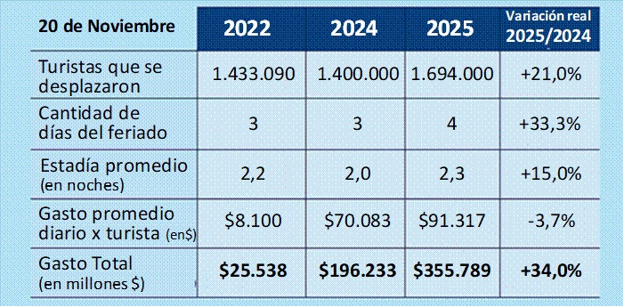 l De acuerdo con el relevamiento de la Confederación Argentina de la Mediana Empresa (CAME), durante el fin de semana por el Día de la Soberanía Nacional se desplazaron 1.694.000 turistas por la Argentina, un 21% más que en el mismo feriado de 2024. El crecimiento se vio favorecido por la combinación de un clima templado, una agenda nacional muy activa y el formato de cuatro días, que amplió las posibilidades de viaje.