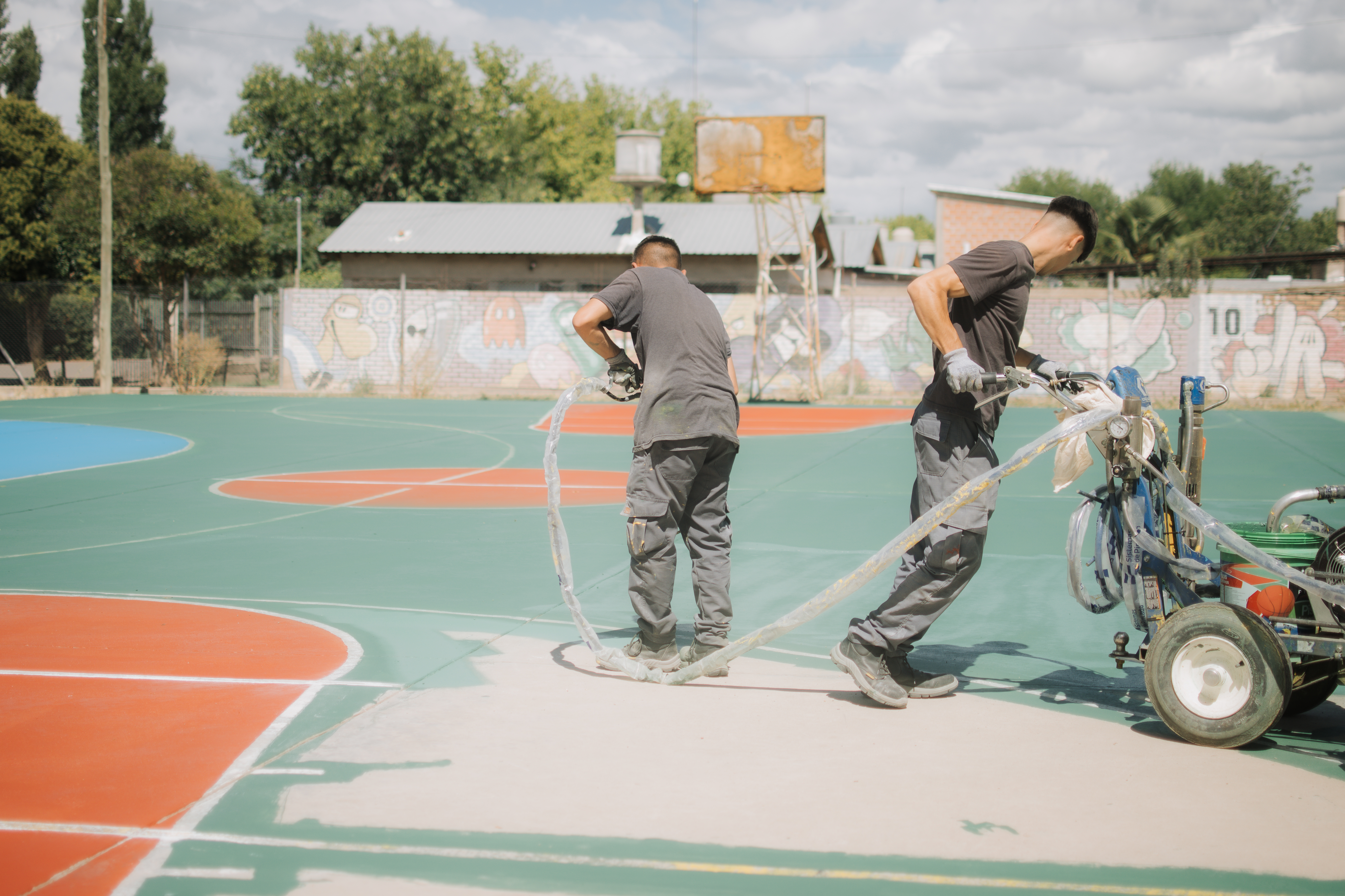 - Aplicación de base selladora para hormigón (si corresponde según estado del soporte), pintura acrílica deportiva para tránsito peatonal y uso intensivo y de bordes perimetrales según corresponda..