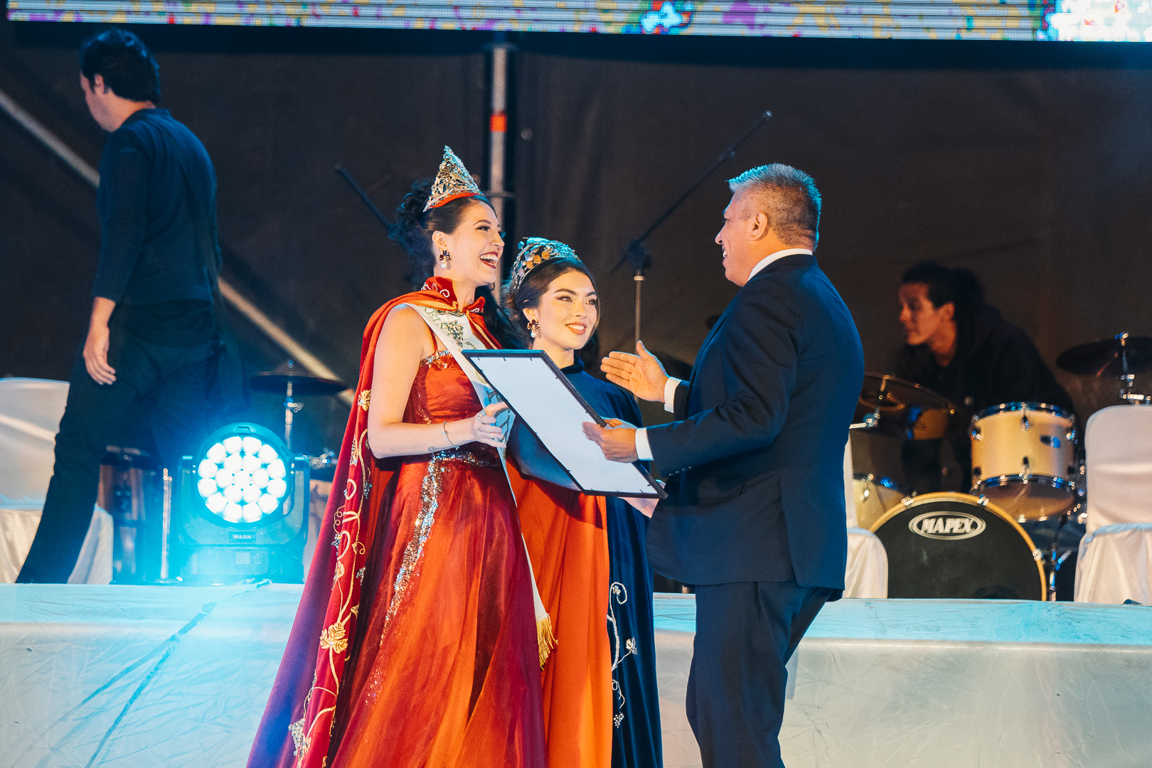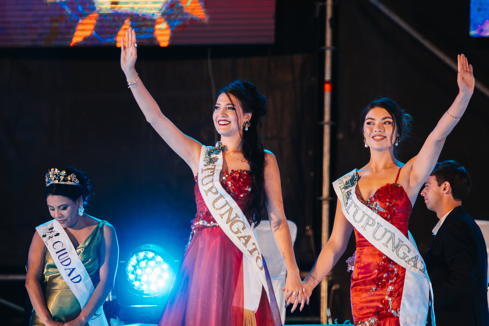 La mesa escrutadora que se encargó de recibir los votos, fiscalizar y controlar el escrutinio para la elección de la Reina y Virreina departamental 2026, estuvo compuesto por la Escribana Noelia Camisay, el Secretario de Gobierno de Tupungato Leonardo Luconi, las Concejales Rocio Belén Gómez y Ruth lucero. Como veedores del acto eleccionario, participaron los representantes de las candidatas distritales de El Peral y Gualtallary, que resultaron elegidos por sorteo el día 26 de diciembre del año pasado: Mariela Calderón y Sergio Galdame. Más tarde, el evento incluyó un homenaje que unió pasado, presente y futuro de la Vendimia. Se destacó a dos Reinas tupungatinas que cumplieron bodas de oro y plata de haber finalizado sus mandatos; 50 años en el caso de Amelia Dean y 25 en el de Soledad Nebot, ambas recibieron obsequios, la banda de reina y formaron parte de un video del que participaron junto a la Reina de la vendimia 2025 Julieta Renzi. Luego de ese momento cargado de memoria y afecto, las candidatas distritales 2026 protagonizaron un cuadro especialmente pensado para la ocasión: bailaron un aire de zamba -acompañadas por bailarines folklóricos- que sintetizó el espíritu de la Vendimia tupungatina en su letra que habla de la identidad del departamento, la montaña, el trabajo de la tierra y el orgullo vendimial, con versos que resonaron en el Teatro: “Desde la montaña viene la canción, brilla Tupungato con todo su sol… Reinas del vino, vino de altura, mirador de estrellas, luz que perdura”. Otro de los clímax de la fiesta fue la sentida Bendición de los Frutos, con la presencia de la Inmaculada Patrona de los Viñedos, la Virgen de la Carrodilla, y la inigualable presentación de la Banda Militar Talcahuano, en la participación del Pastor Edgardo Lera y el Cura Párroco Alejandro Squizziato, por supuesto no faltaron el clásico golpe de reja y afilada de zapa ejecutados por el Intendente Gustavo Aguilera, símbolo del trabajo y la esperanza en una nueva cosecha. Tupungato volvió a decir gracias a quienes trabajan la tierra y sostienen, año tras año, la identidad vendimial. La Vendimia Departamental también tuvo como protagonistas a las siete candidatas distritales 2026, Giuliana Platese de San José, Rocio Espósito La Carrera, Jésica Cisterna Ciudad, Delfina Cuello El Peral, Martina Torres La Arboleda, Micaela Galdame Gualtallary y Lourdes Casatta de Villa Bastías, quienes asumieron este camino con compromiso, formación y una fuerte impronta solidaria, acompañando de manera conjunta a una institución de la comunidad que es el merendero del Cordón del Plata "Carita de Ángel". Antes de que comience el espectáculo artístico las Majestades Julieta Renzi y Celina Flores compartieron palabras de despedida en agradecimiento al año de reinado transitado y posteriormente comenzó el show que se ganó aplausos, despertó risas y emoción de los espectadores.