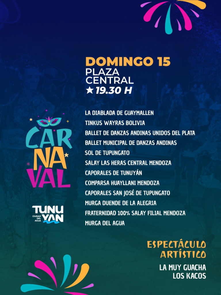 El domingo 15, el espectáculo iniciará con un desfile de11 grupos de bailarines que recorrerán distintos sectores de la plaza y realizarán su despliegue artístico sobre calle San Martín. Participarán agrupaciones de caporales, salay, diablada, tinkus, comparsa y murga: La Diablada de Guaymallén, Tinkus Wayras Bolivia , Ballet de Danzas Andinas Unidos del Plata , Ballet Municipal de Danzas Andinas Sol de Tupungato , Salay Las Heras Central Mendoza , Caporales de Tunuyán, Comparsa Huayllani Mendoza , Caporales San José de Tupungato, Murga Duende de la Alegría, Fraternidad 100% Salay Filial Mendoza y Murga del Agua.