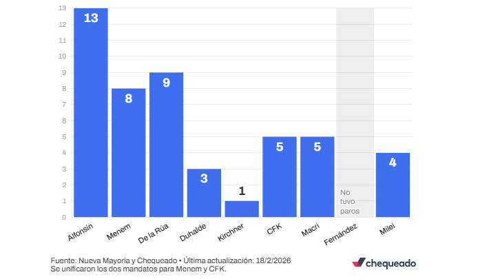 Los únicos presidentes que no tuvieron paros generales fueron los gobiernos de Cristina Fernández de Kirchner (Frente para la Victoria) -en su primer mandato- y Alberto Fernández (Frente de Todos).